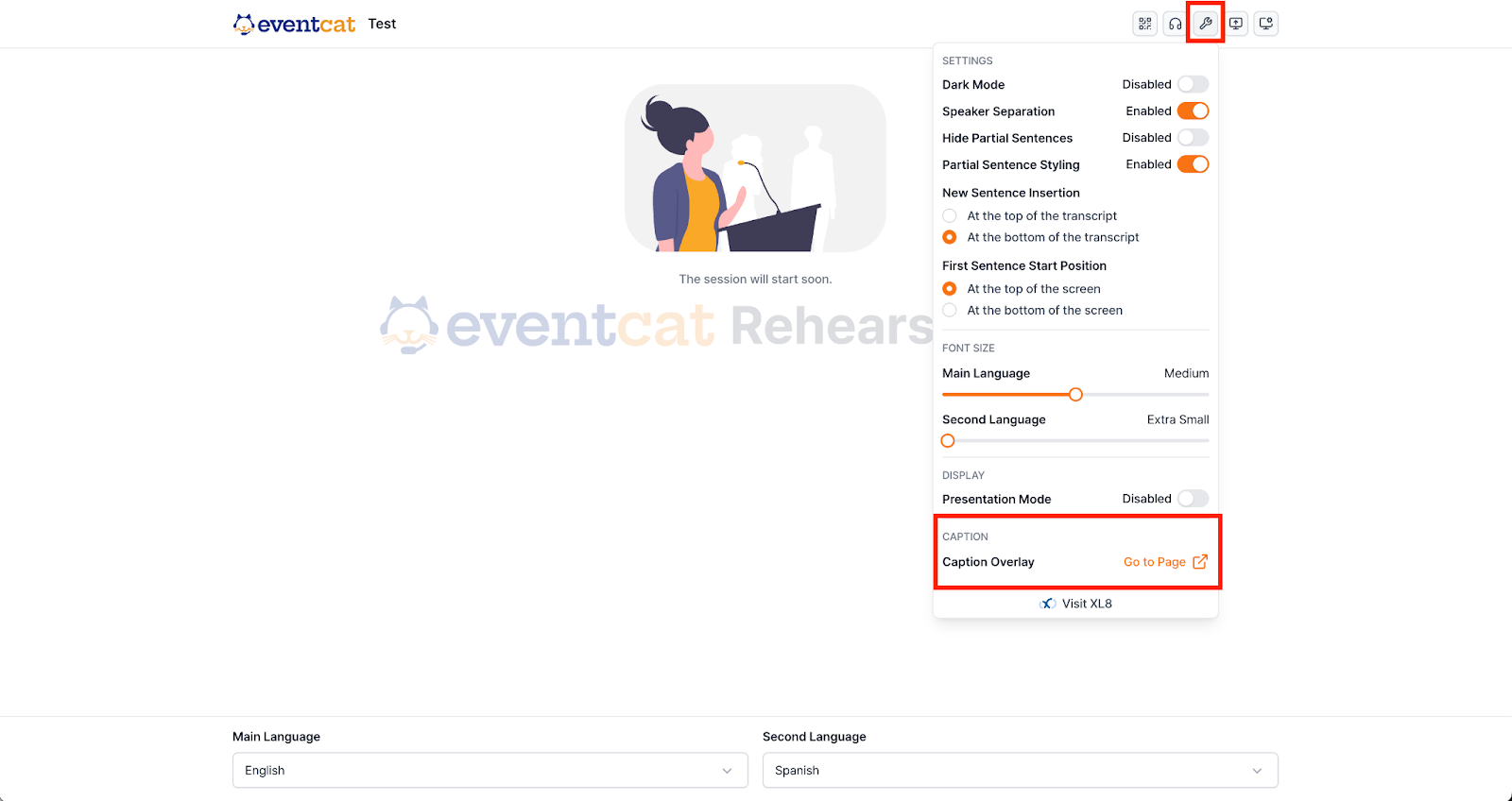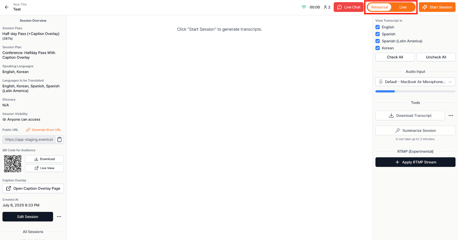 Before your event, make sure you’re in Rehearsal Mode and click Start Session to test that the translation appears correctly.
