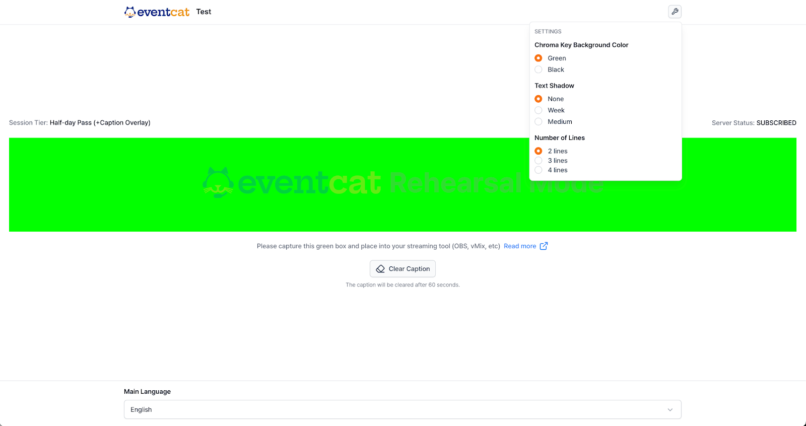 You can enable the caption overlay feature as an add-on to EventCAT’s Half-Day or Full-Day passes.