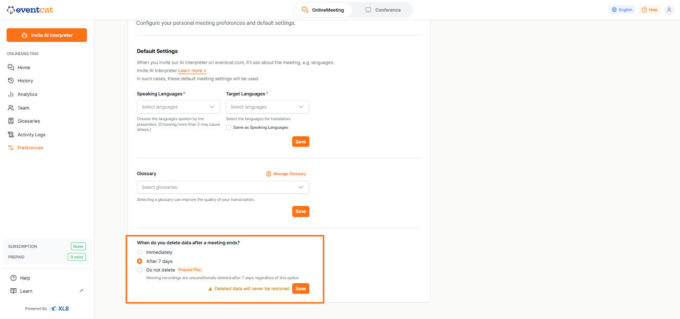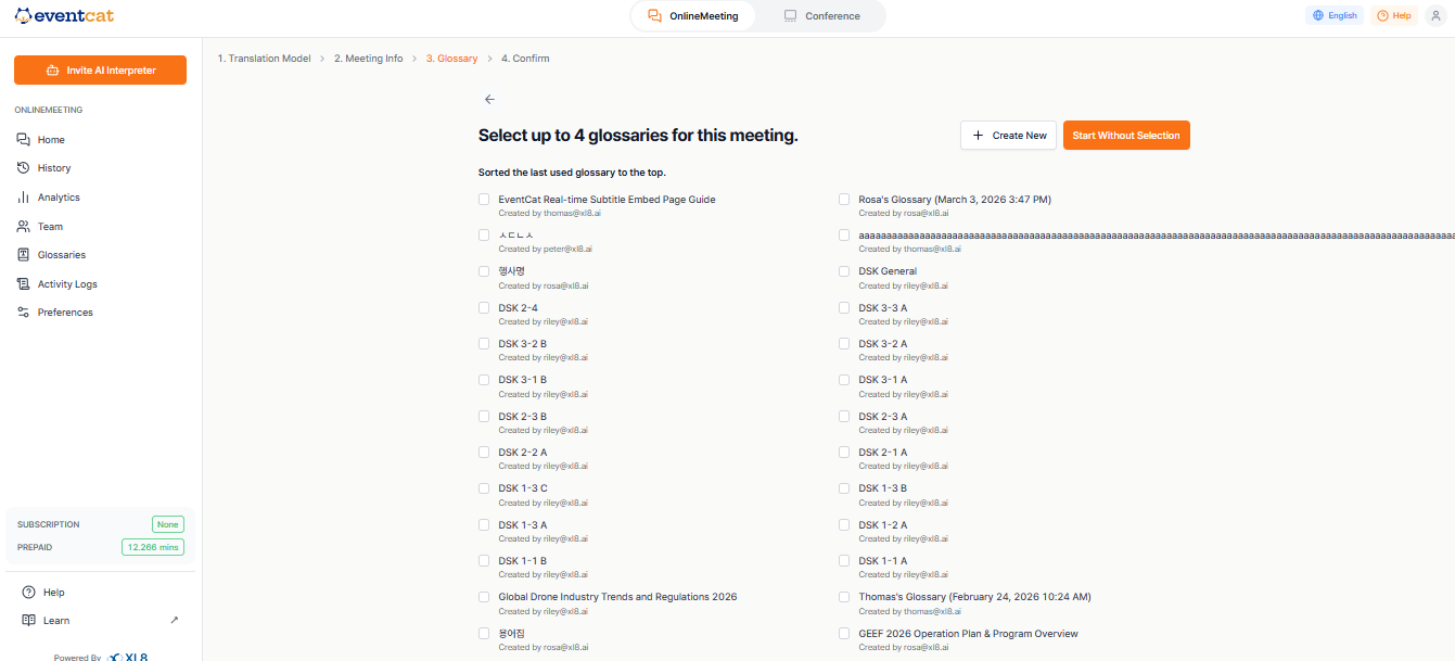 Once the EventCAT AI Interpreter joins your meeting, you can’t change the languages. Make sure both languages are correctly set before inviting it.
