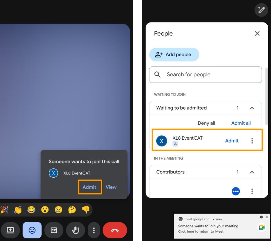 - If the online meeting is password-protected, or depending on the meeting platform, the host or a participant may need to click “Admit” to allow the EventCAT AI Interpreter to join.
