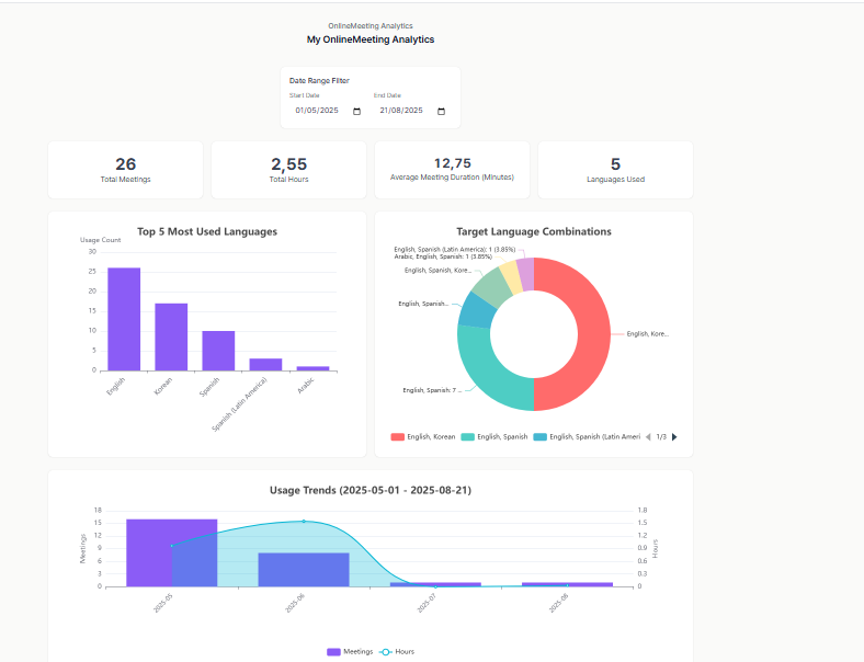 With OnlineMeeting Analytics, you get a clear overview of your activity in one place. Track the number of meetings, total hours, average duration, and languages used.