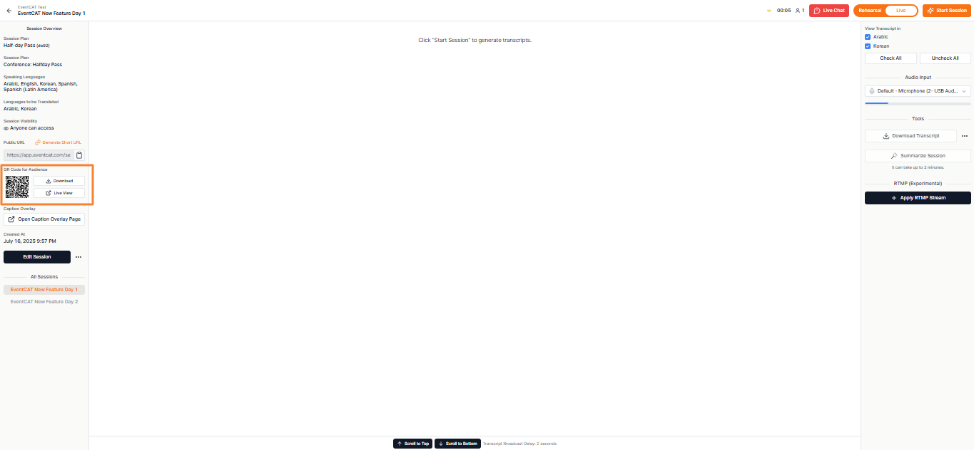 Configure on-site screen captions and download QR codes for multilingual caption access
