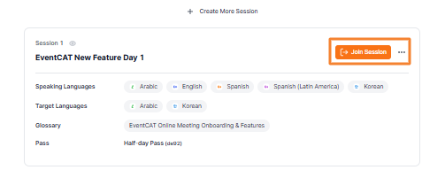 After purchasing a plan, create a session, set the languages, and use real-time interpretation in the “Conference Room”
