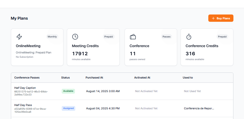 This plan allows you to prepay for as many hours as you need and use them across multiple sessions. For example, if you purchase 5 hours, you can split them into several events, such as 30 minutes, 1 hour, or 2 hours each. Ideal for short workshops, lectures, or internal seminars that are held frequently. Supports up to 100 simultaneous connections to the real-time caption page and includes features such as Glossary, Transcript, and Meeting Summary. - Half-day Pass: $300 / 6 hours