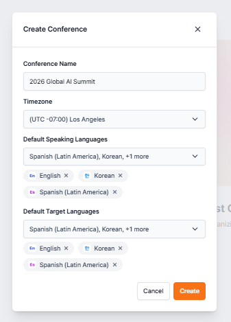 A conference is the space where you prepare and operate the actual event. You can handle all the necessary preparations before the event begins, including session creation, language settings, applying passes, and setting up real-time captions. After navigating to the conference room, click Create