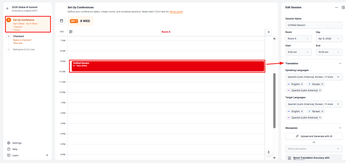 To achieve more accurate AI simultaneous interpretation, it’s essential to review the glossary, language, and audio settings before the event starts.