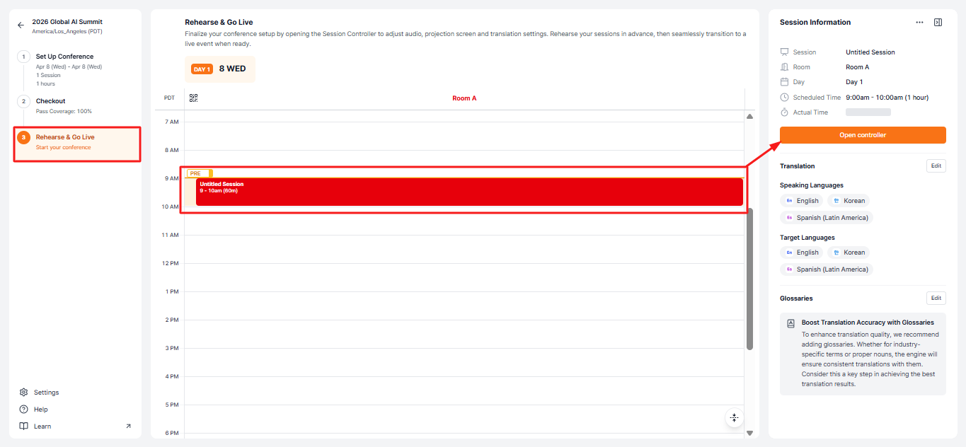 Once all conference settings, sub-sessions, pass applications, glossary, audio, and language settings are complete, you can now start the rehearsal with the same setup environment as the actual event.