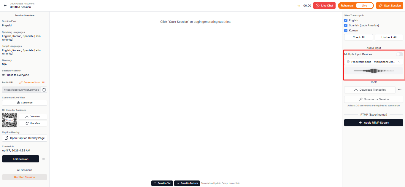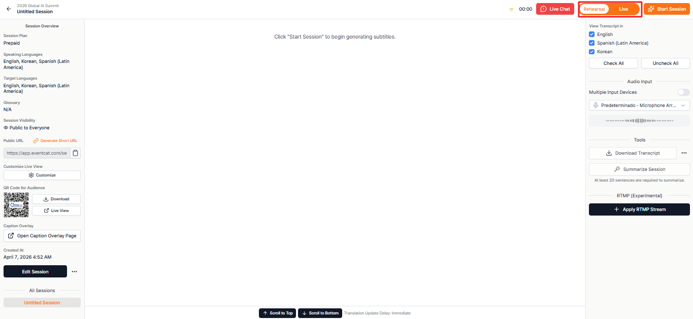 The Controller is the page where you can manage key settings and progress before and during the event. From here, you can check glossary application status, source and subtitle languages, audio input status, and also quickly view the URL and QR code to share with participants.