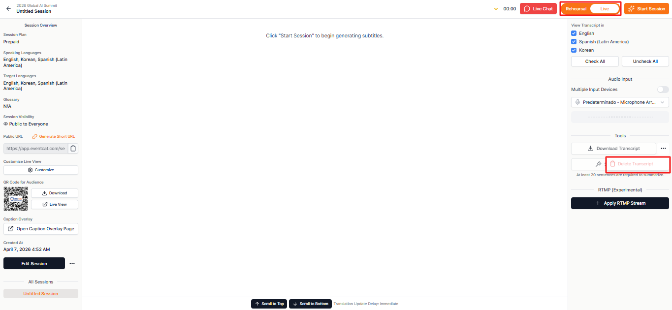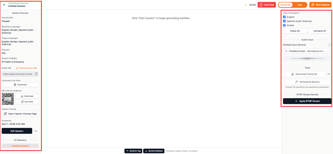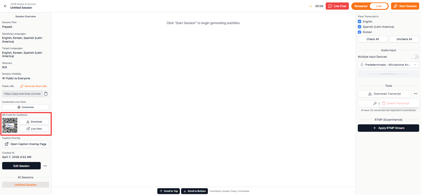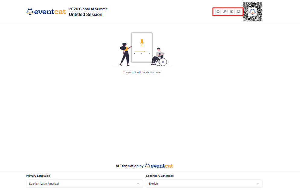 - Participant Access Info: Share the URL and QR code for participants to view subtitles on their personal devices.