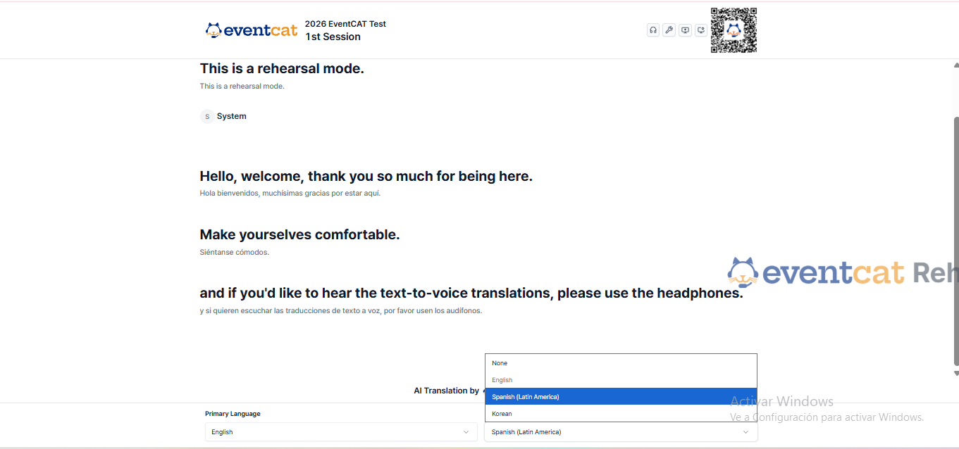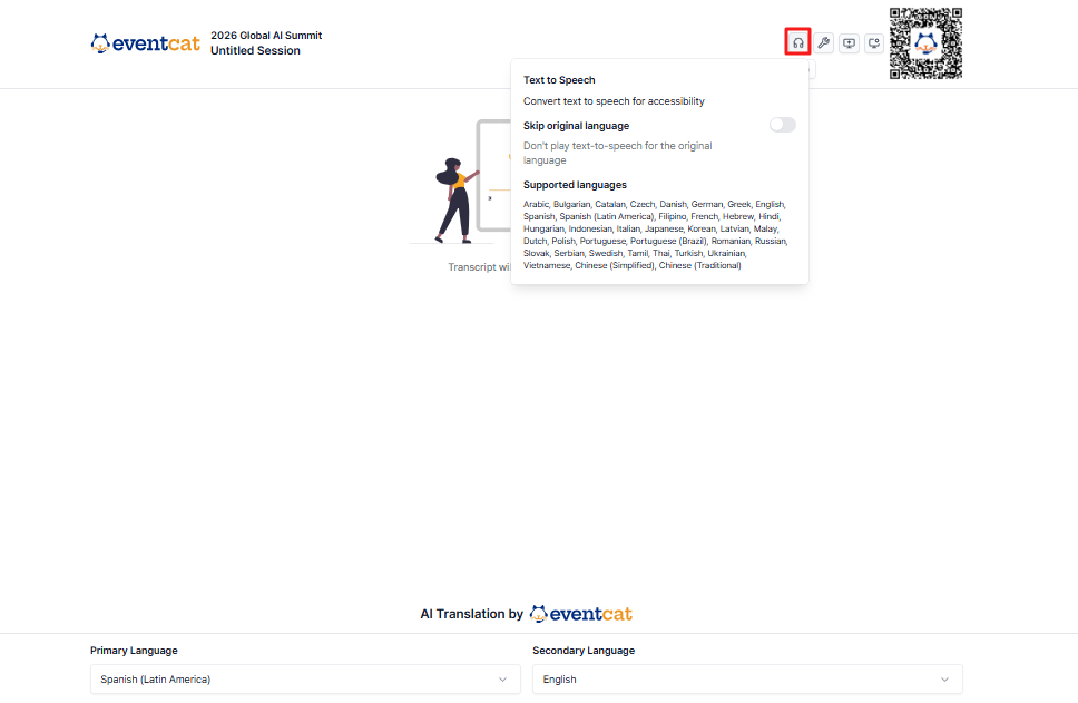 EventCAT also supports Text-to-Speech (TTS) functionality in addition to subtitles. After accessing via QR code, participants can connect headphones or a headset to their personal device to listen to the translated content in their preferred language.