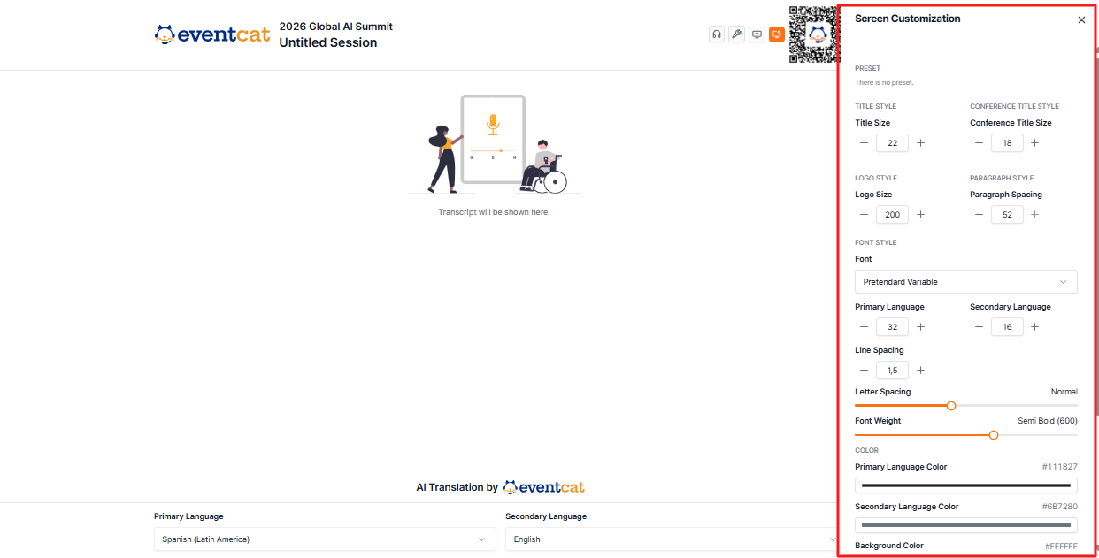 By displaying this screen on the event hall's screen, attendees can immediately see the real-time translated subtitles during the session.