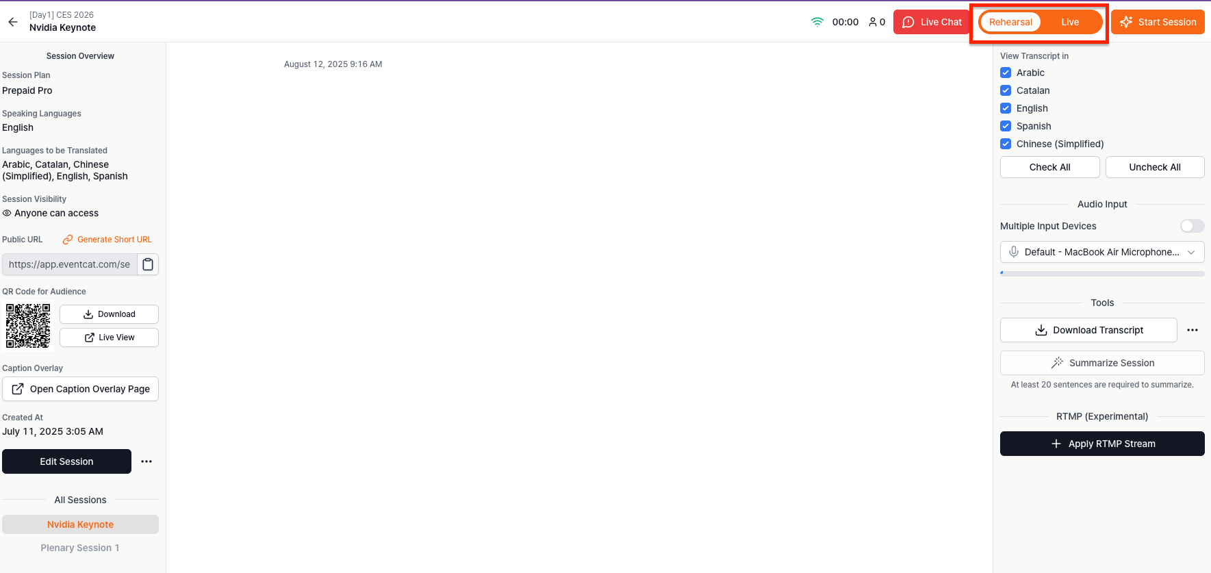 Want to make sure everything works before your live session? Rehearsal Mode allows you to test audio devices, language settings, and layout design in a private environment. Nothing is visible to attendees until you switch to Live Mode.