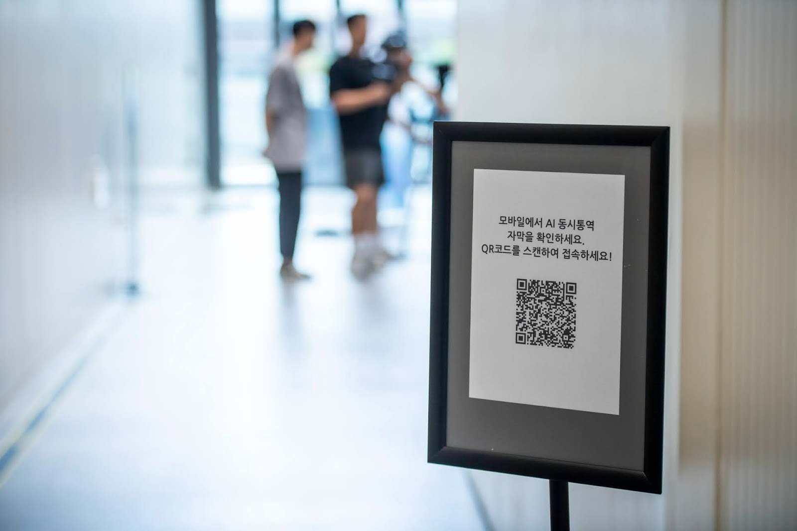 Attendees can scan the QR code in advance (via email or website) or on site (via banners, signs, or screens) to access live translations instantly. You can send it ahead by email/website, and also show it on site via X-banners, POP signs, or projector screens.