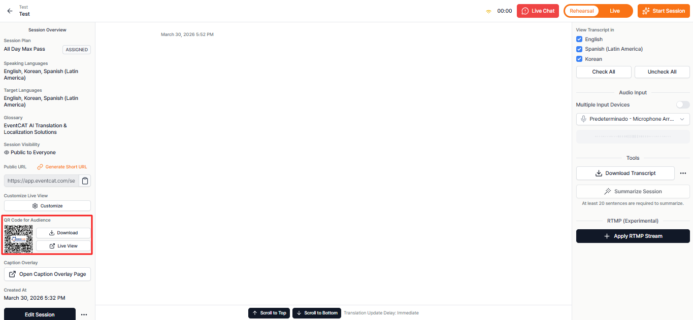 This opens the live translation page for the currently running Session. Participants open live translation instantly—no app required.