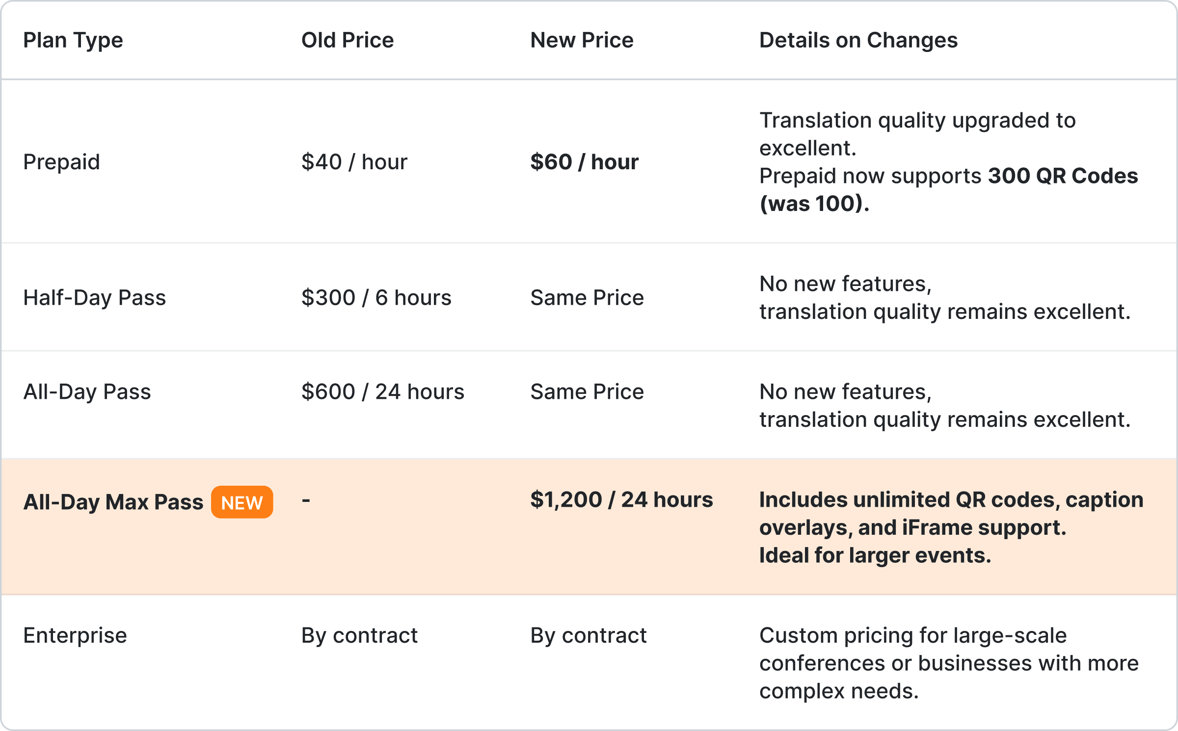 Our new Conference pricing structure is built for scale, supporting multi-day events, higher attendee volumes, and complex multilingual requirements. These plans provide predictable pricing and enterprise-grade performance for professional conferences. Here's the new pricing table: